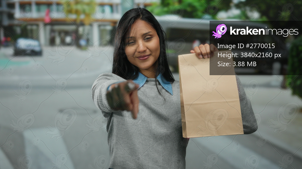 Woman standing street holding bag smiling pointing urban, street, woman, smiling, brown, bag, city, young, pointing, female