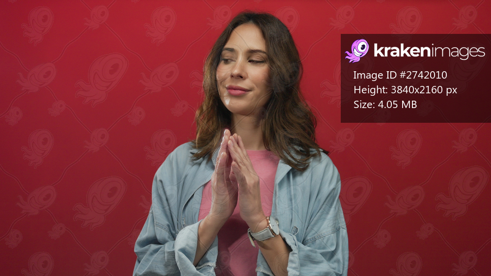 Woman standing with thoughtful expression against bold red background wearing casual denim shirt conveying contemplation and introspection in isolated studio setting - Kraken Images