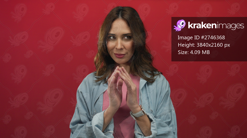 Woman standing with thoughtful expression against bold red background wearing casual denim shirt conveying contemplation and introspection in isolated studio setting - Kraken Images