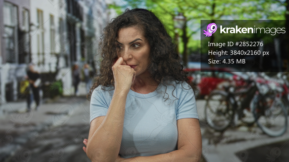 Woman standing and touching her nose with her finger under green trees beside parked bicycles on a city street; doubt.