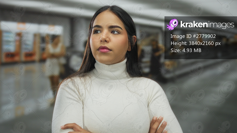 Woman stands confidently in a busy airport terminal, wearing a white sweater and looking thoughtful amidst the bustling indoor environment.