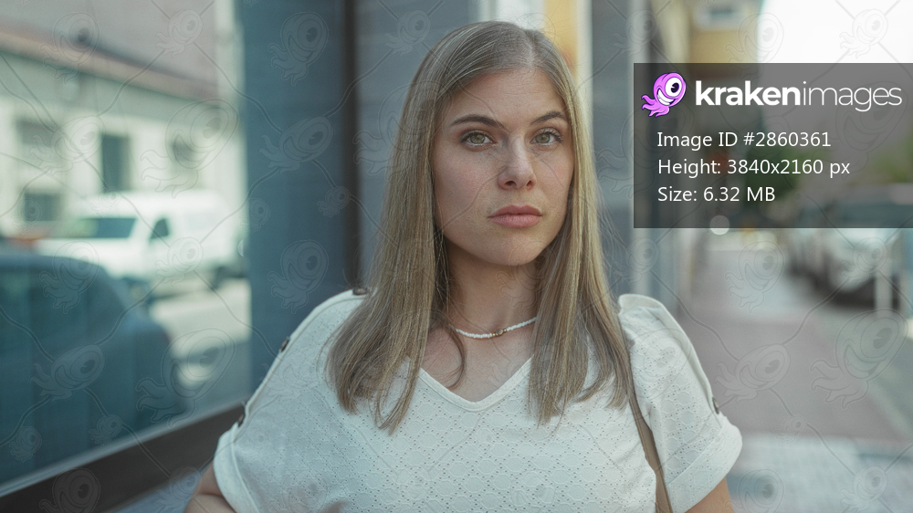 Woman stands with exposed face on street in bright daylight, wearing casual shirt and necklace, gaze steady forward; confidence empowerment independence strength. - Kraken Images
