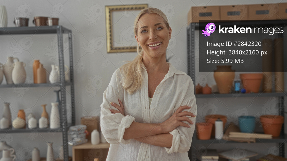 Woman stands with foldedarms in a studio among pottery shelves and ceramic vases; creative confidence.