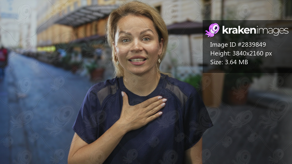 Woman stands with hand on chest gesture on a busy cobblestone street between historic building facades; sincerity.
