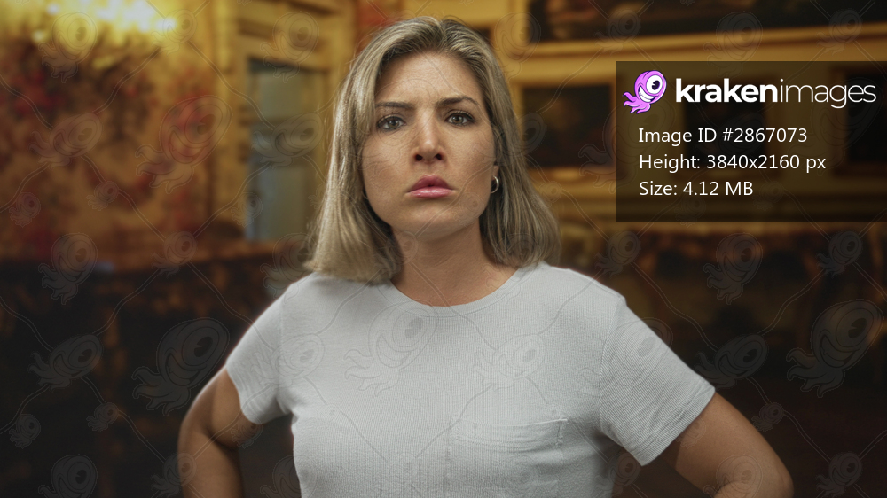 Woman stands with hands on hips looking sideways in ornate museum building with framed paintings and tapestries; confidence.
