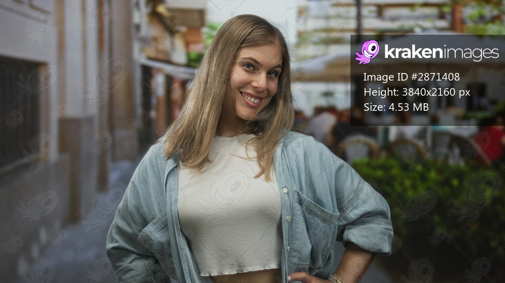 Woman stands with hands on hips and smiles beside outdoor restaurant tables on street; carefree confidence.
