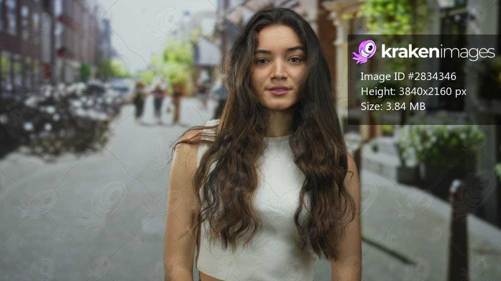 Woman stands looking at camera in a sunlit city street wearing a white tank top with long brown hair; confidence.