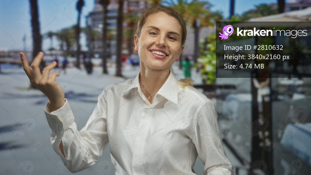 Woman stands on city terrace gesturing playfully as if playing an air guitar, with palm trees and outdoor restaurant setting in background, dressed in white shirt smiling. - Kraken Images