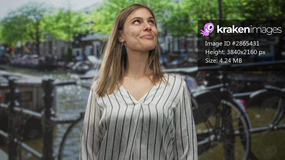 Woman stands on street by canal under green trees and parked bicycle near brick buildings; serenity.