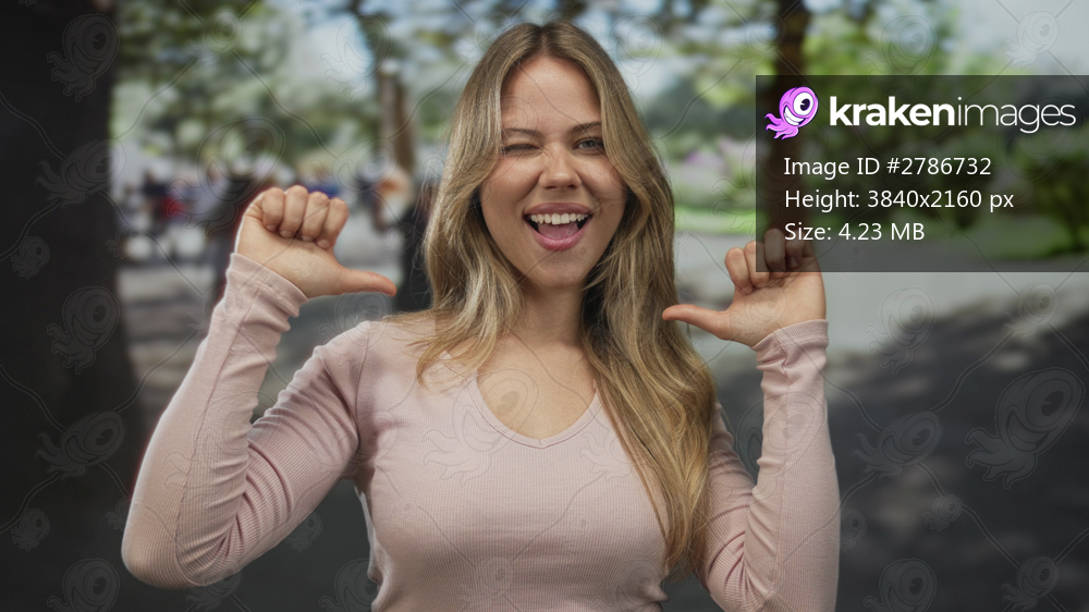 Woman stands and points thumbs at chest in green park under bright sunlight and trees; confidence pride.