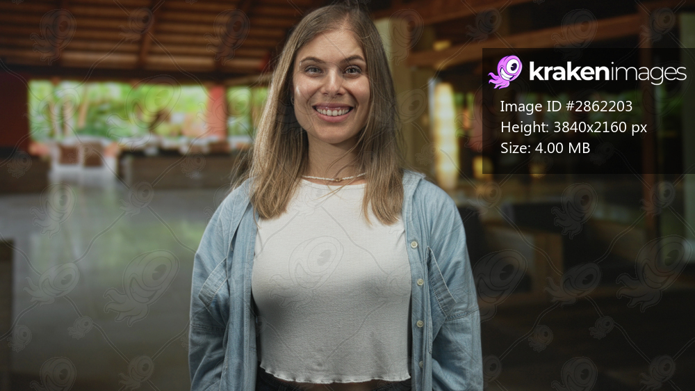 Woman stands smiling showing teeth and relaxed posture in a hotel building lobby with wooden beams and seating; happiness.
