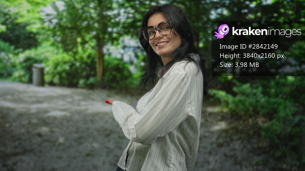 Woman stands smiling while holding her hand out in a brightly sunlit forest clearing under green canopy; serenity.