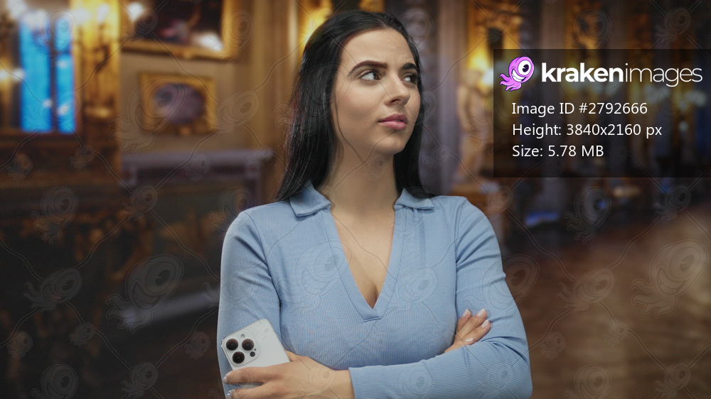 Woman stands thoughtfully inside an ornate museum wearing a blue shirt with her arms crossed and holding a smartphone amidst dimly lit artwork.