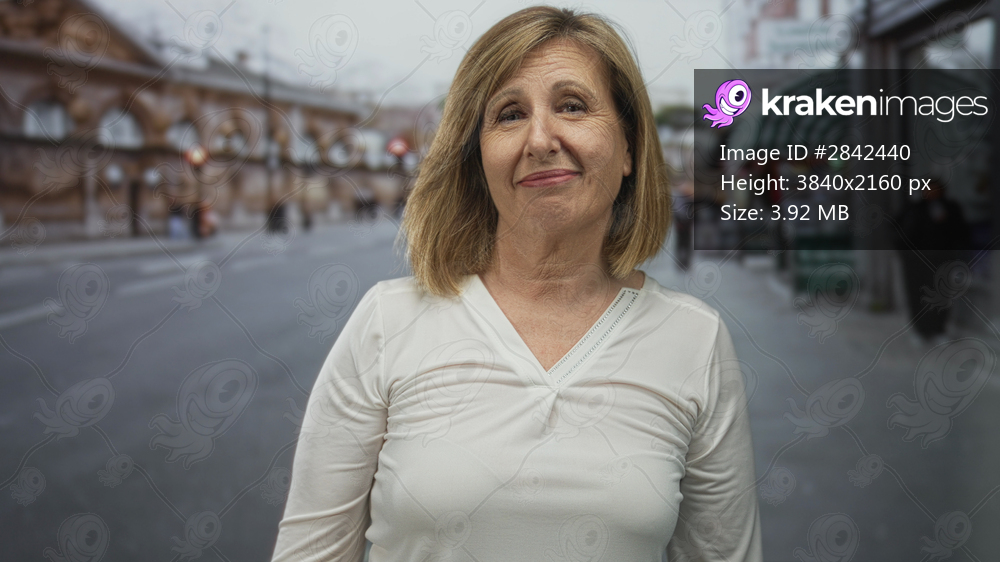 Woman stands and waves hand on sunlit busy city street in afternoon; social connection warmth friendliness.