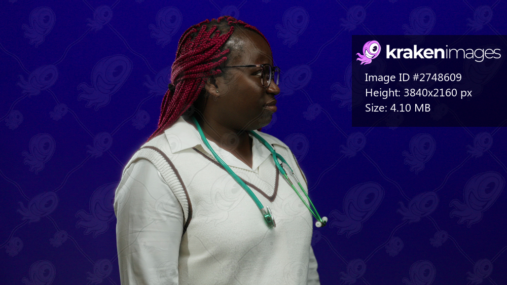Woman with stethoscope and braids stands against isolated blue background conveying professional healthcare theme