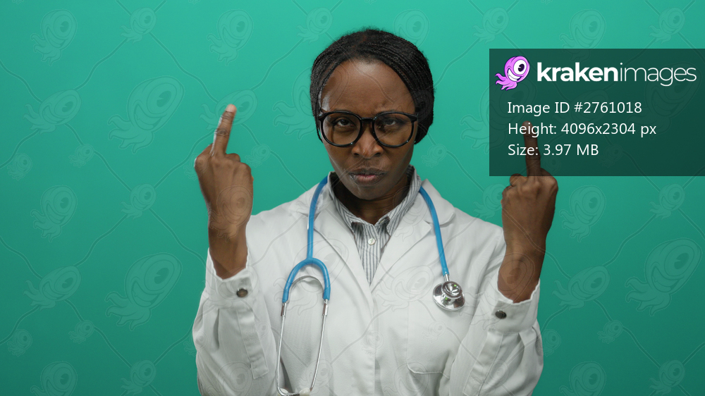 Woman with stethoscope gestures on green background, showing expression and emotion, framed in a professional medical setting, wearing glasses as she stands confidently. - Kraken Images