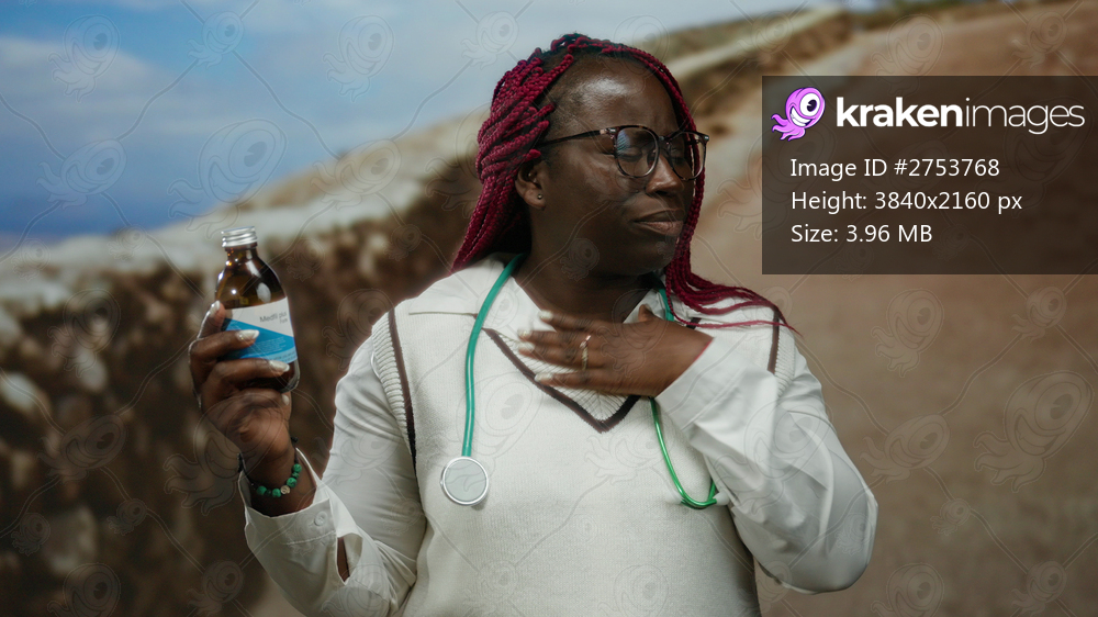 Woman with stethoscope on seaside promenade holds a bottle looking concerned, suggesting throat pain, set against a scenic beach backdrop with clear skies and natural surroundings. - Kraken Images