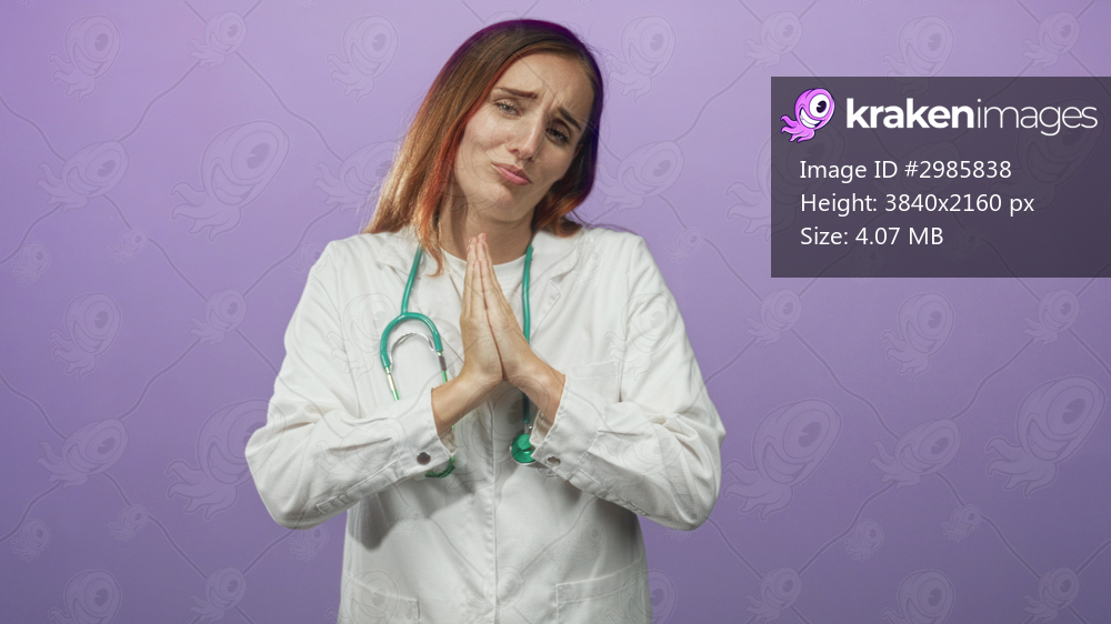 Woman with stethoscope presses hands together in a pleading prayer gesture on a studio purple backdrop; pleading apology.