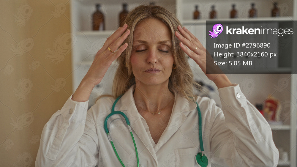 Woman with stethoscope rubbing her face in clinic while wearing doctor uniform as young blonde in hospital room.