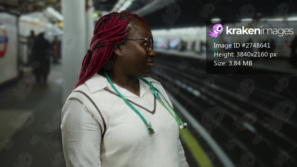 Woman with stethoscope standing at railway platform indoors, wearing white, glasses, showcasing diverse medical professional during bustling travel environment. - Kraken Images