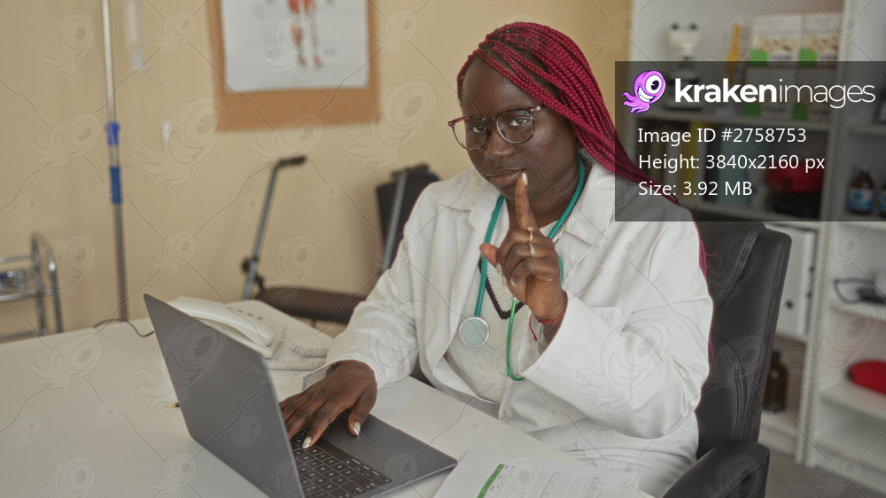 Woman with stethoscope working on laptop in a clinic room, demonstrating professional focus during a medical consultation with modern equipment in the background. - Kraken Images
