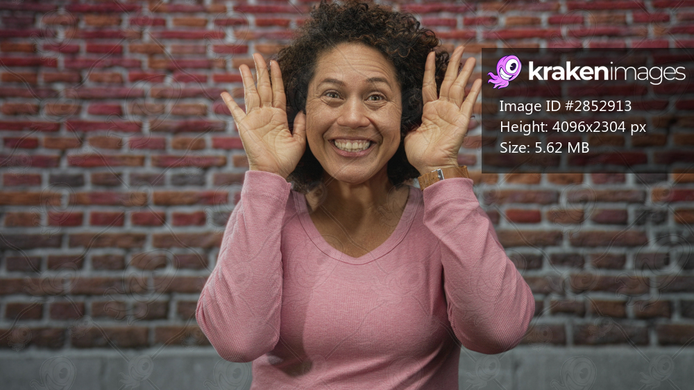 Woman sticking out her tongue and removing hands from her face in a brick wall studio setting, wearing pink sweater and wooden watch; playful.