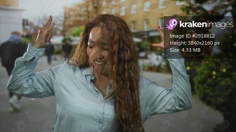 Woman sticking out tongue and making rock horns with hands on a city street lined with christmas trees; playful celebration.