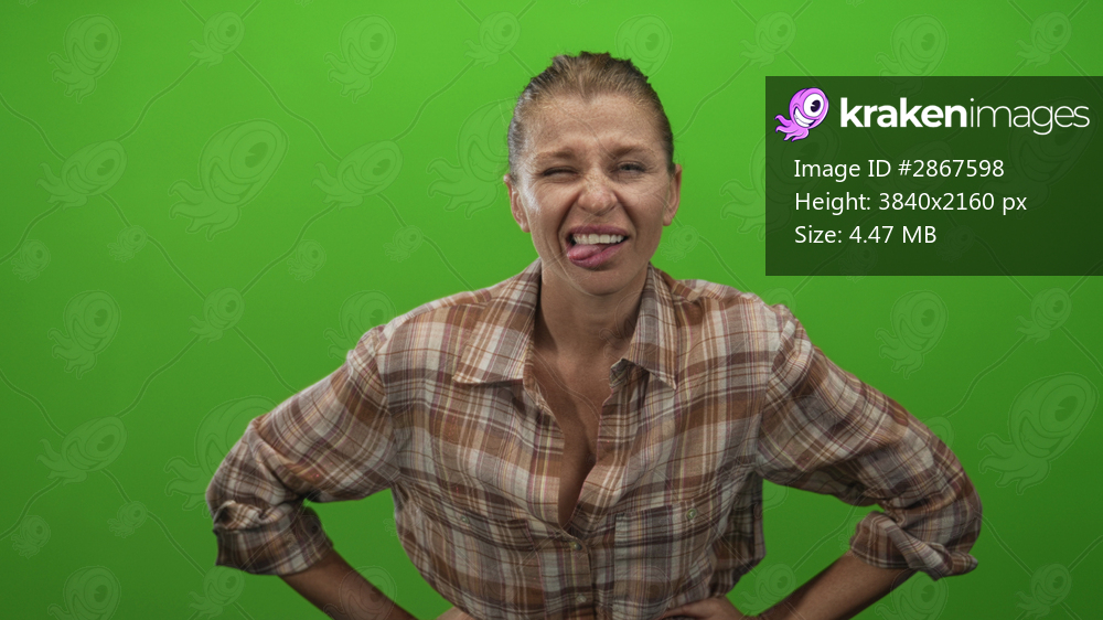 Woman sticking tongue out with both hands on hips wearing brown plaid shirt against bright green studio backdrop; playful cheekiness.