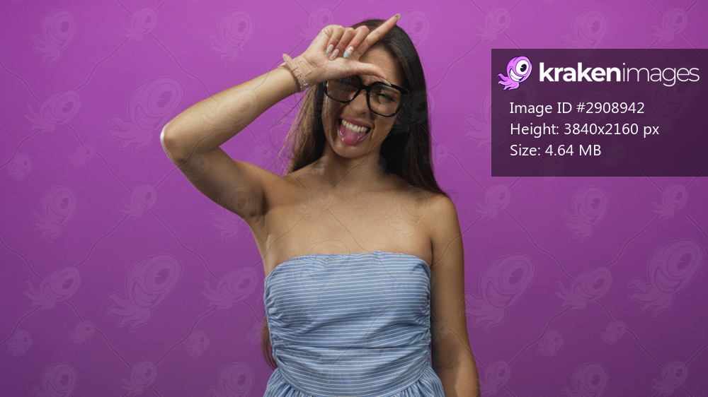 Woman sticking tongue out and making l sign on forehead in purple studio wearing strapless blue dress; playful young fun.