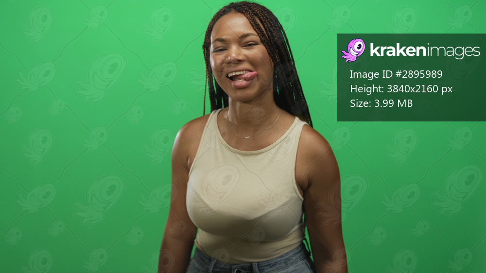 Woman sticking tongue out and showing bare breast in green studio with tank top and denim jeans visible; playful confident.