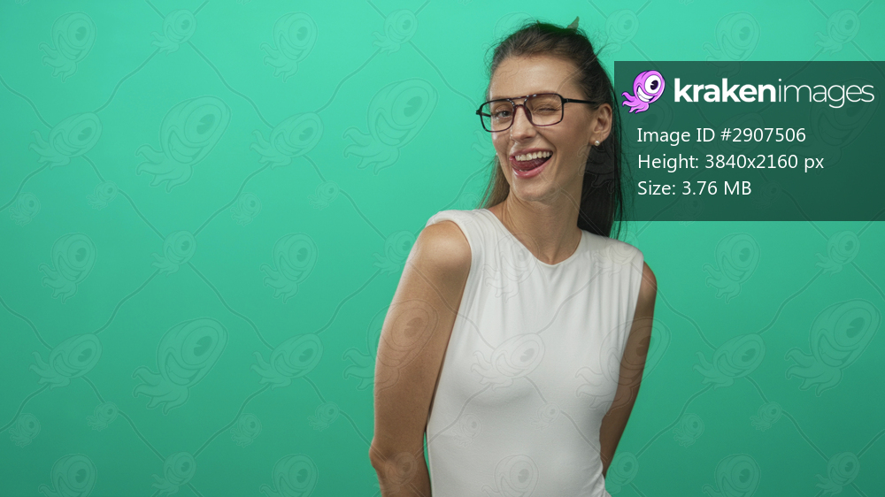 Woman sticking tongue out and smiling with glasses in a green studio, wearing white sleeveless top and leaning slightly; playful confidence.
