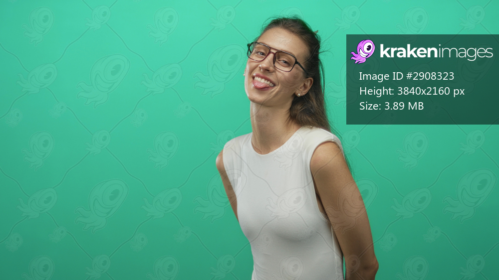Woman sticking tongue out and smiling with glasses in a green studio, wearing white sleeveless top and leaning slightly; playful confidence.