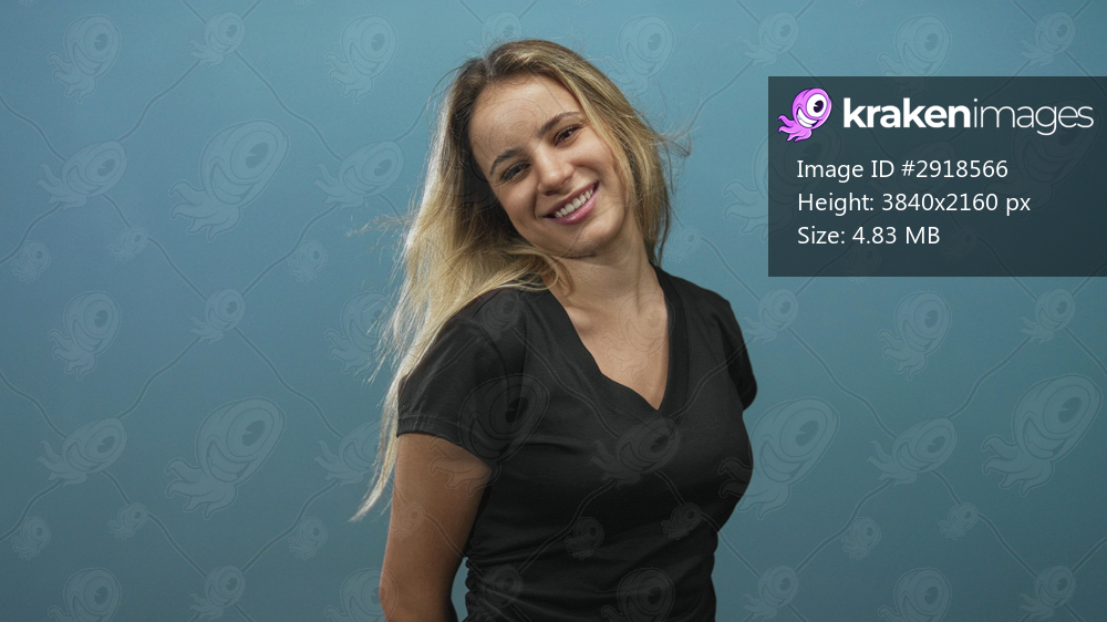 Woman sticking tongue out with tilted head and visible smile in blue studio setting wearing black v neck tee and relaxed pose; playful carefree joy.