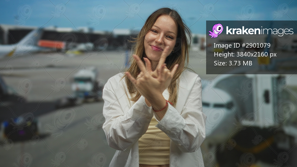 Woman sticks out tongue and makes rock horns with both hands at airport terminal gate; playful wanderlust.