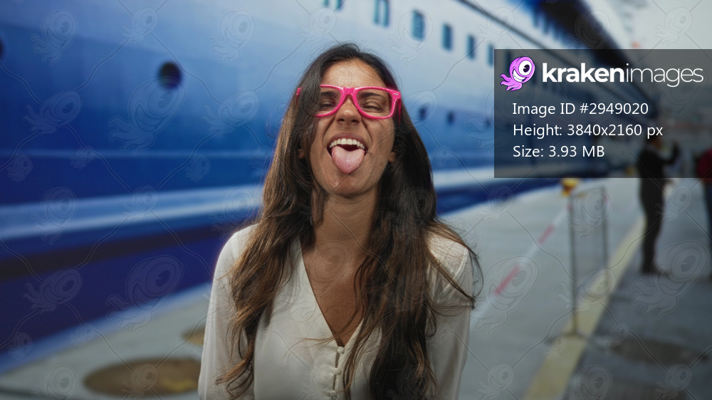 Woman sticks tongue out beside a large blue cruise ship at a port, wearing bright pink glasses and white blouse; playful confidence.