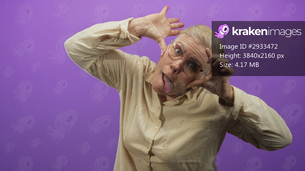 Woman sticks tongue out and makes silly face with hands while wearing glasses in purple studio; playful mischief.