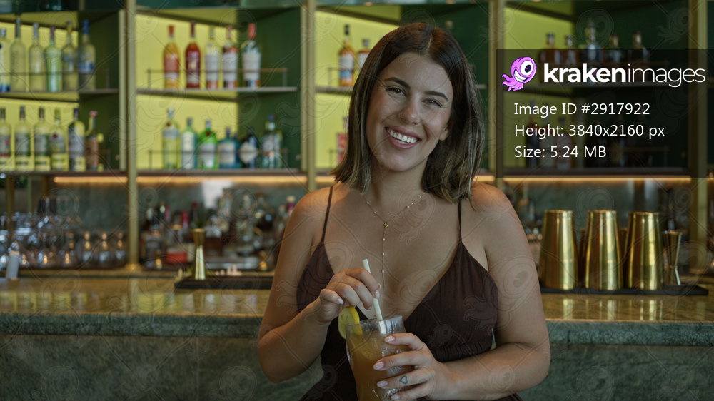 Woman stirring a drink with a straw and holding a glass, cleavage visible at bar; social relaxation joy.