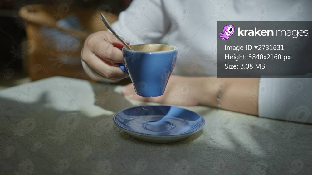 Woman stirring coffee in a blue cup at a mediterranean restaurant, showcasing a relaxed indoor setting bathed in natural light and shadows on a stone table. - Kraken Images