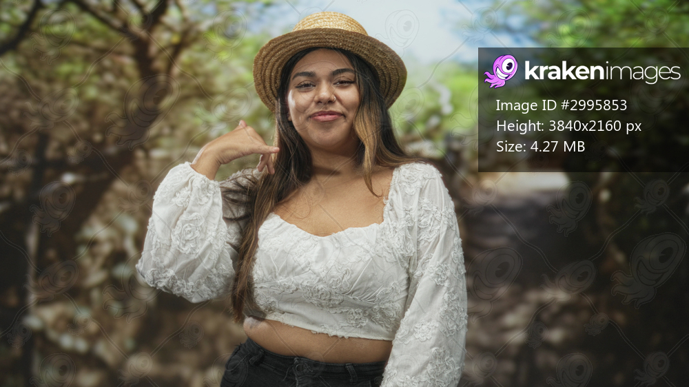 Woman with straw hat and long hair showing a thumb to ear call gesture, wearing a white embroidered crop top that reveals bare midriff in a studio; playful confidence. - Kraken Images