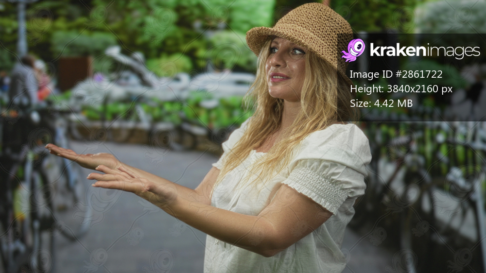Woman with straw hat and white blouse shrugs with palms up on a city street lined with bicycles and green park foliage; playful curiosity.