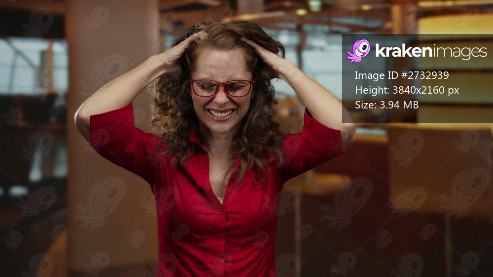 Woman stressed in restaurant with hands on head wearing red shirt and glasses, showing frustration indoors at a coffee shop setting.