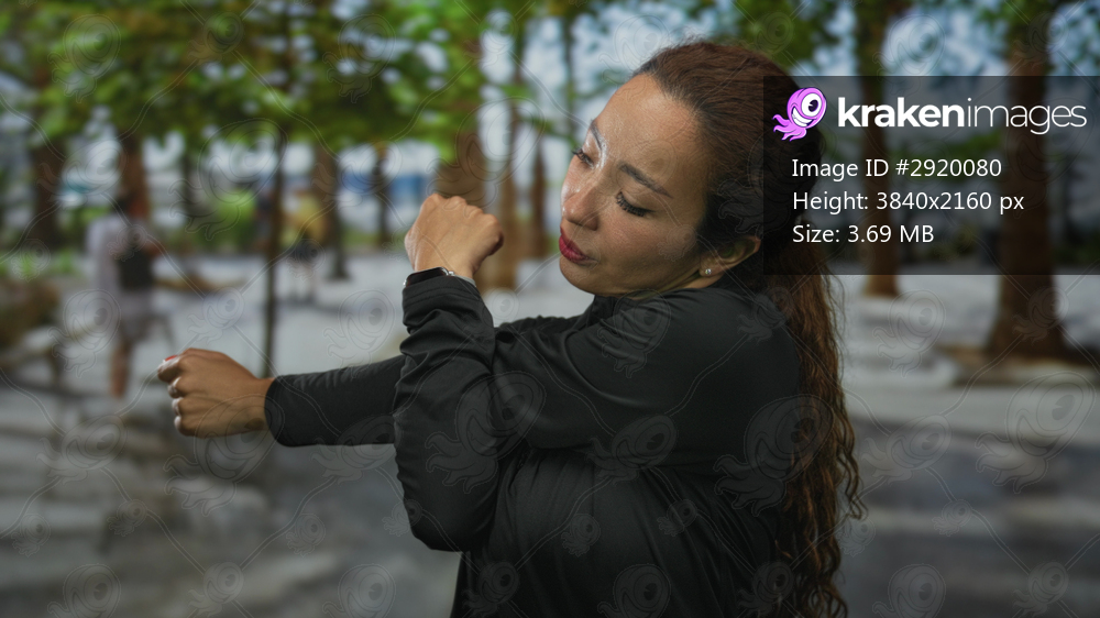 Woman stretches arm across chest while checking smartwatch in seaside park with palm trees and walkway; determination wellness.