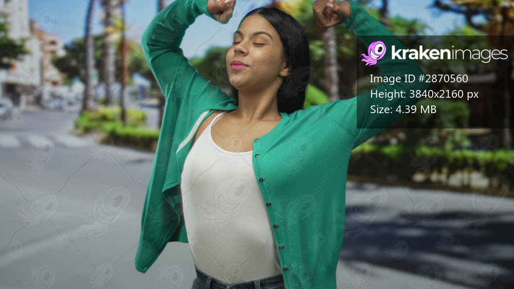 Woman stretches arms in green cardigan on urban street lined with palm trees and parked cars; serenity.
