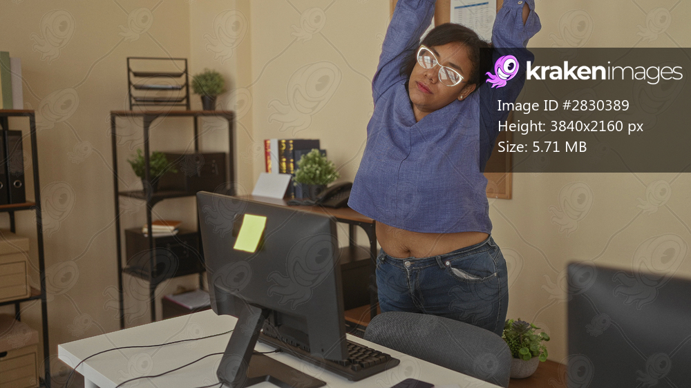 Woman stretches arms over computer monitor at office desk inside building; work break relaxation rejuvenation.