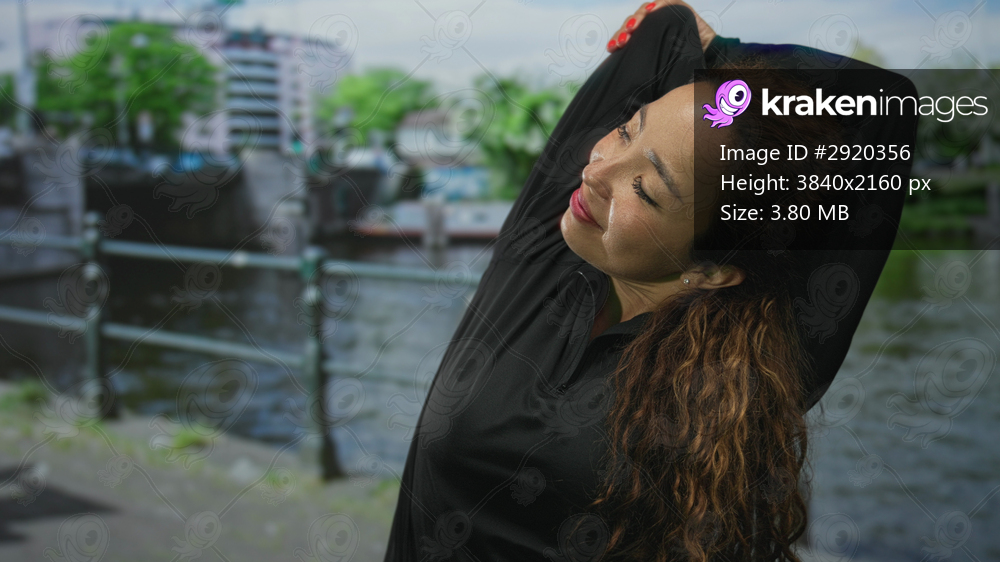 Woman stretching arms behind head on street in amsterdam showing long hair and relaxed posture; calm relaxation.