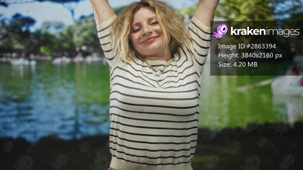 Woman stretching with arms raised and eyes closed by a green park lake wearing striped sweater, relaxed smile; serenity leisure.