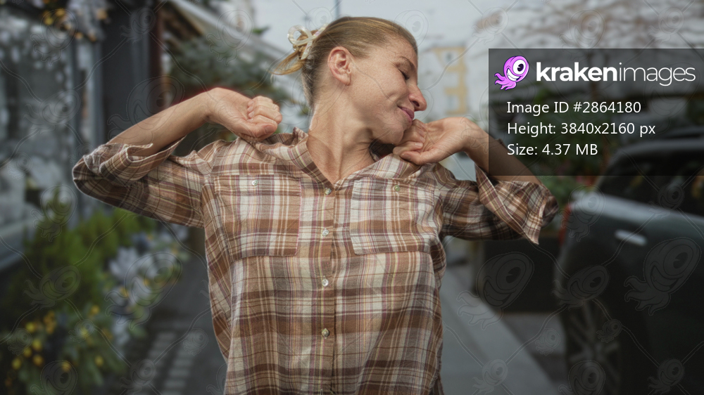 Woman stretching arms wide on a city street with closed eyes and slight smile while wearing plaid shirt and reaching outward; tired recovery.