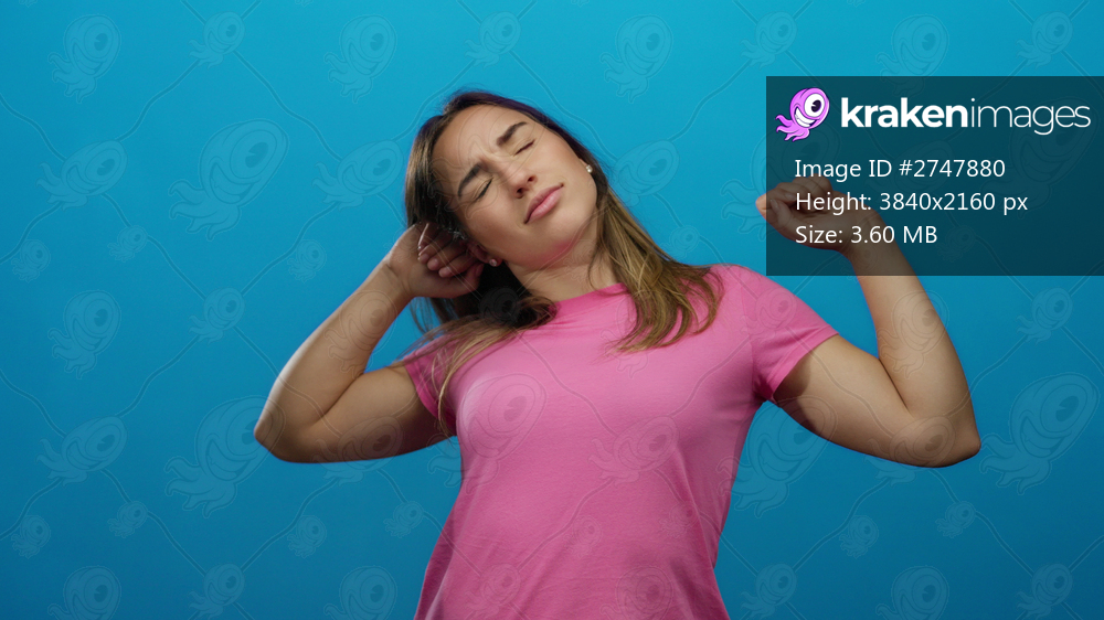 Woman stretching with closed eyes isolated on a bright blue background, expressing relaxation, wearing a pink shirt, blonde hair, young adult, peaceful, casual expression. - Kraken Images