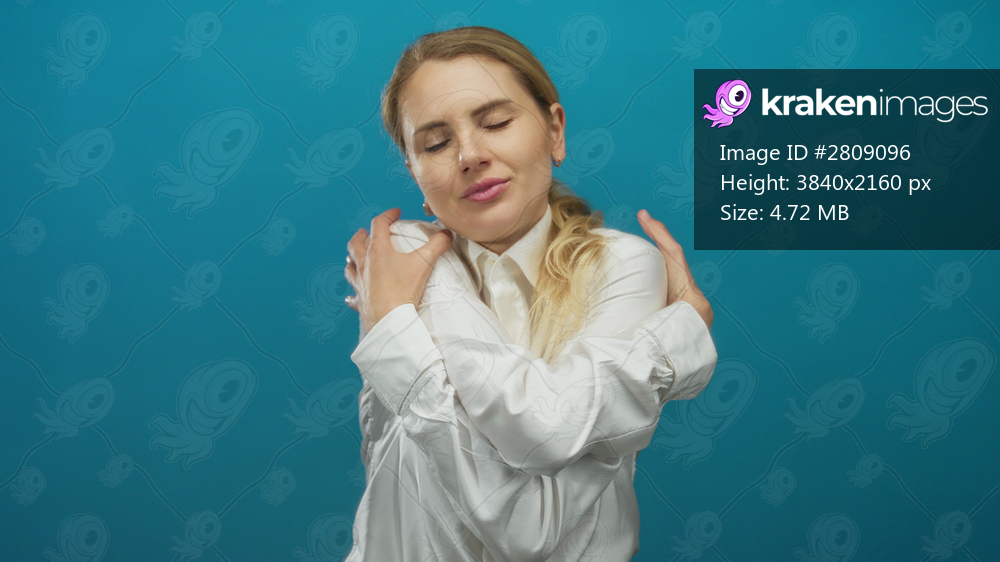 Woman stretching and embracing herself against blue background, expressing relaxation and self-care in isolation for mental wellness and positivity.
