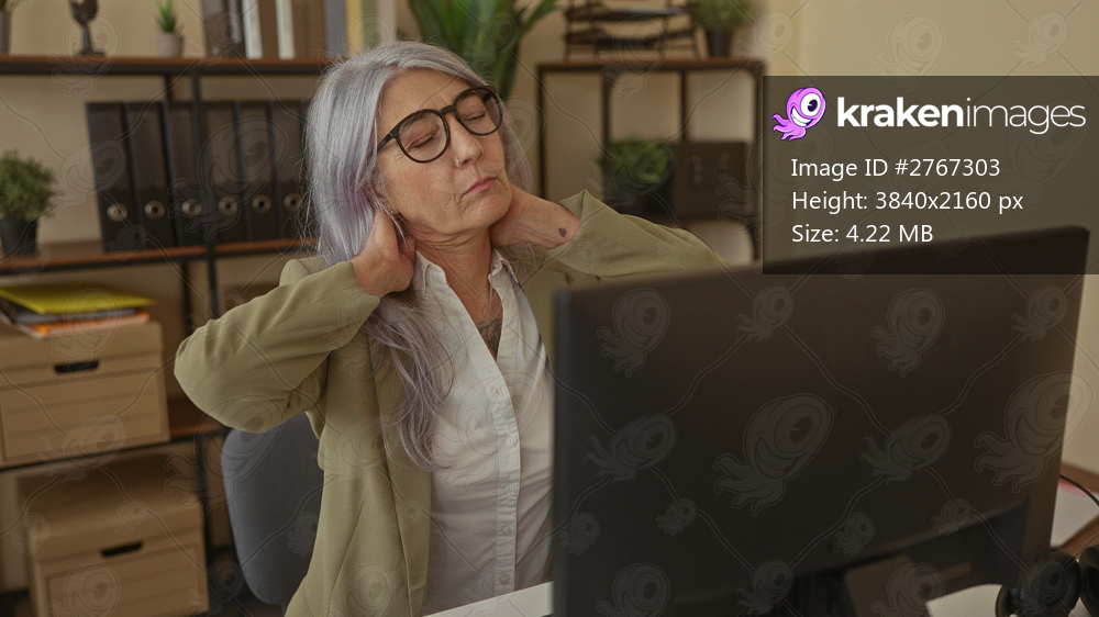 Woman stretching neck in office setting at computer desk indoors, showing signs of fatigue, with grey hair and glasses, suggesting workplace stress and need for relaxation. - Kraken Images